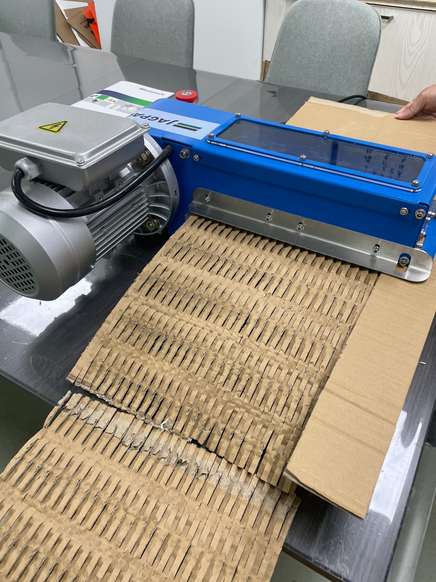 A:紙板緩沖機(jī)的構(gòu)造原理類似于碎紙機(jī),通過電機(jī)驅(qū)動鏈帶和齒輪傳動系統(tǒng),帶動一組刀具進(jìn)行互動切割,對廢舊瓦楞紙板實施“膨切”處理,將其轉(zhuǎn)化為具有緩沖性能的網(wǎng)狀填充材料。
